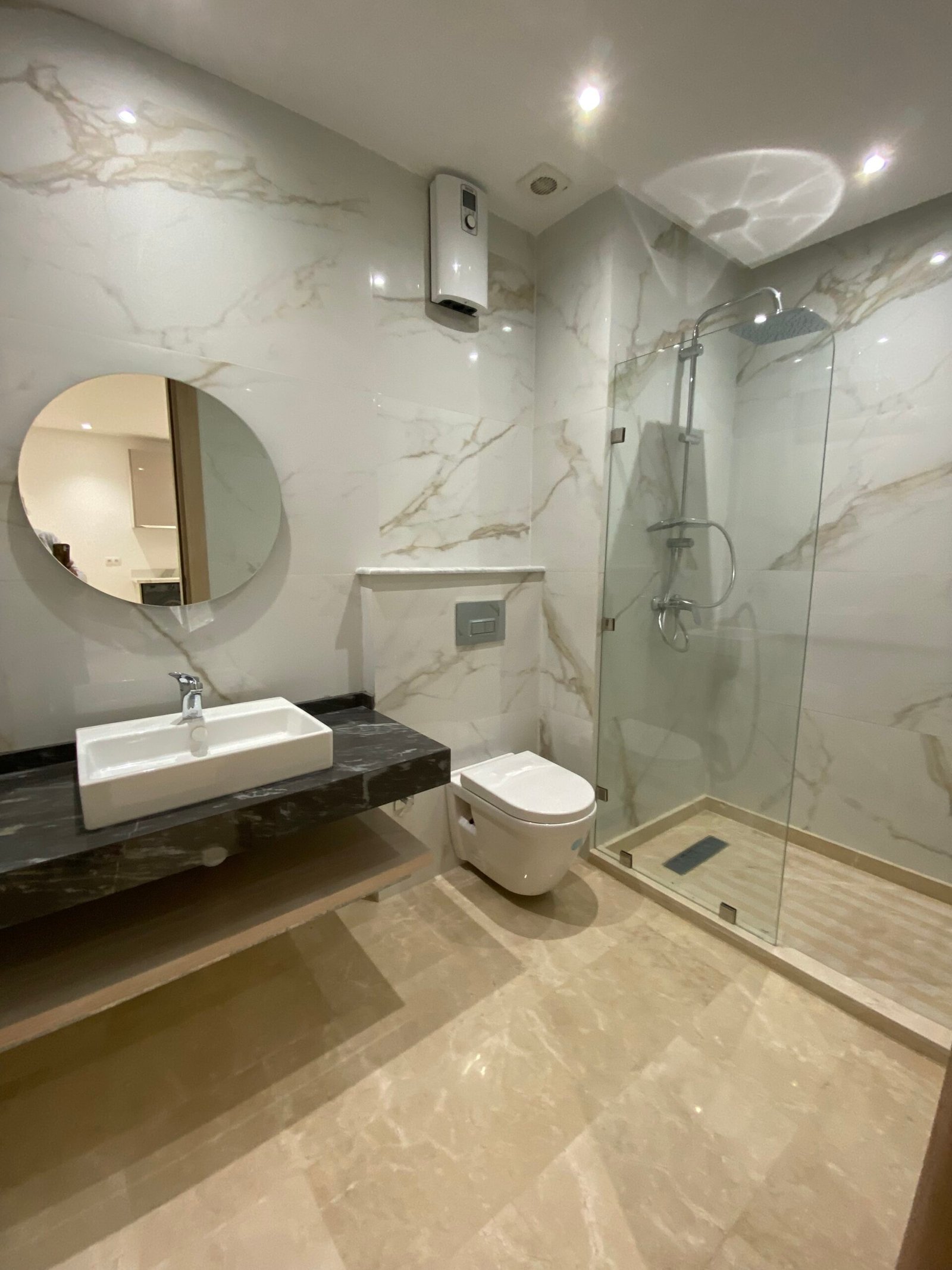 Badkamer met inloopdouche en marmerlook tegels