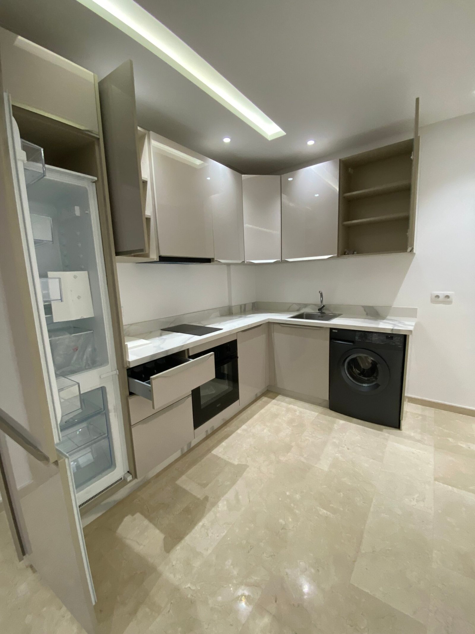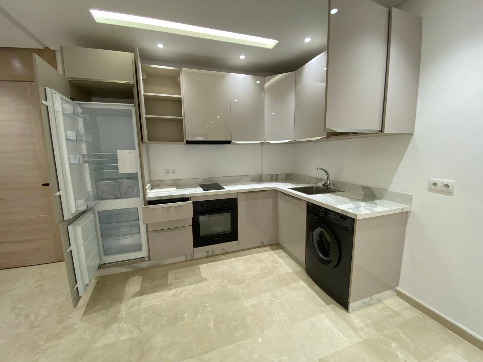 Ingerichte keuken met inductieplaat, oven, wasmachine, koelkast en afzuigkap