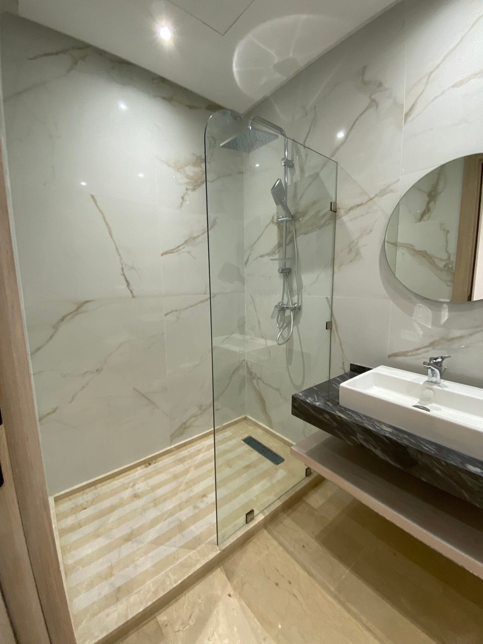 Badkamer met inloopdouche en marmerlook tegels
