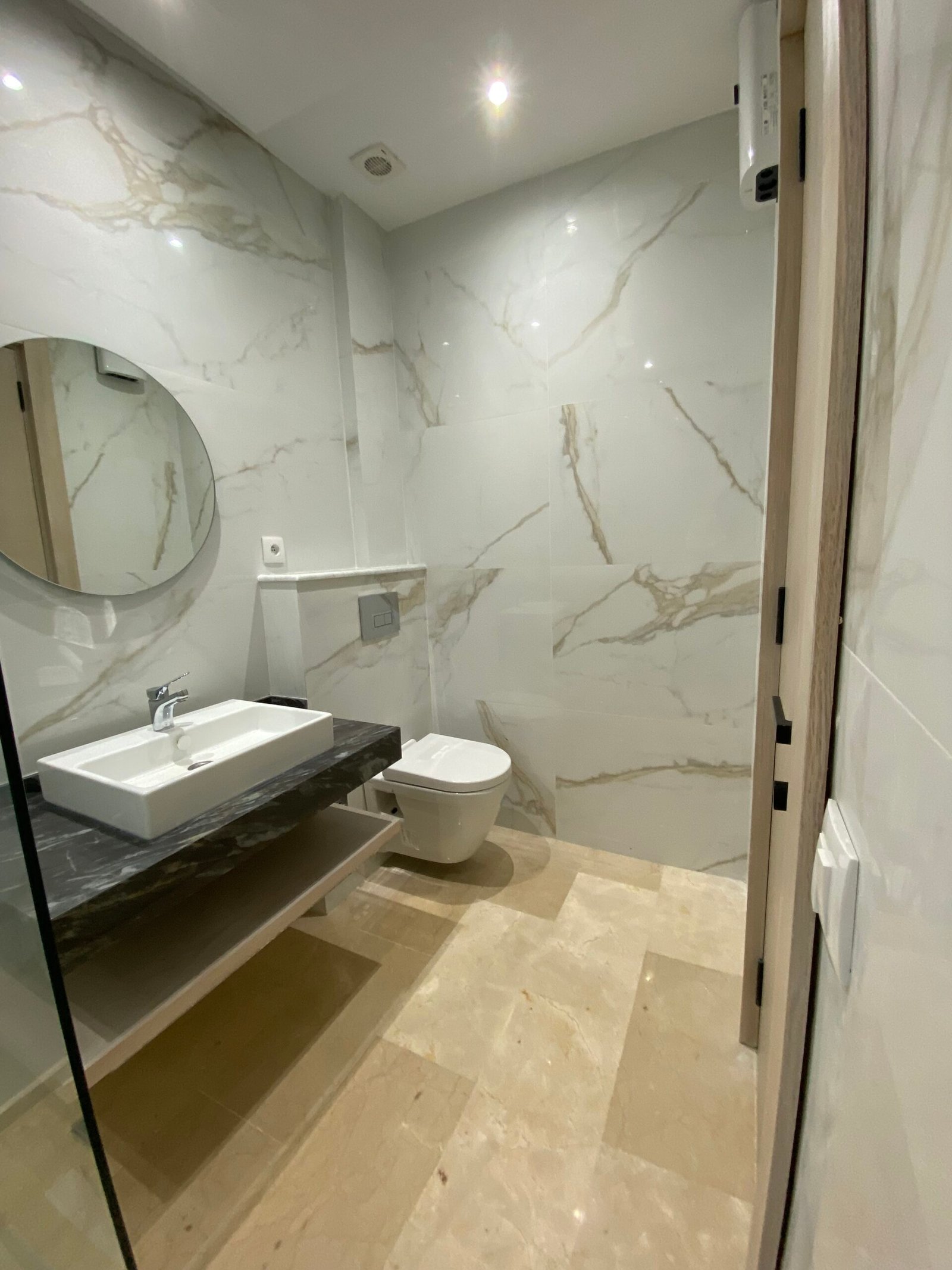 De badkamer is modern ingericht met een inloopdouche, marmerlook tegels en kwaliteitsvol sanitair.