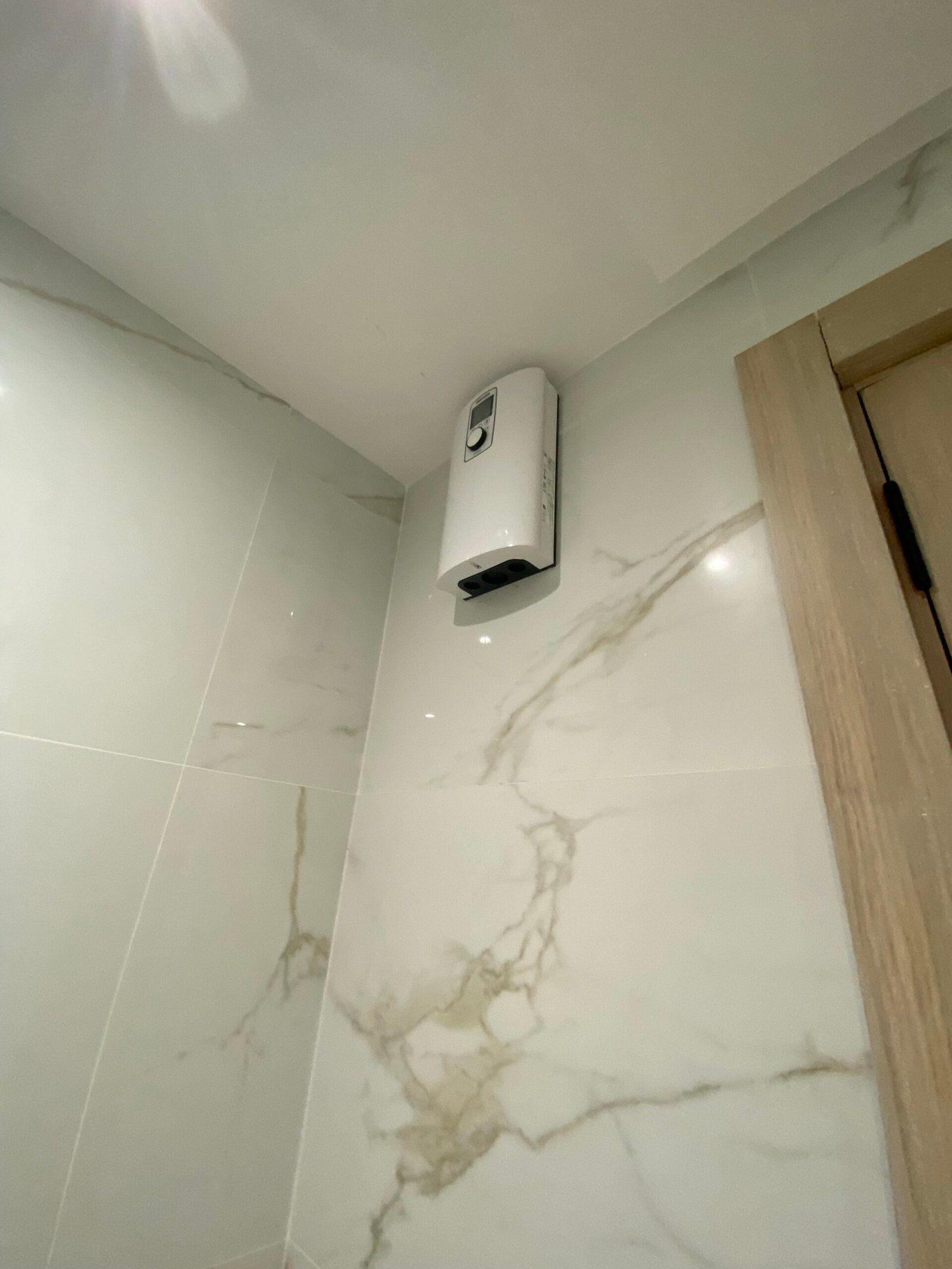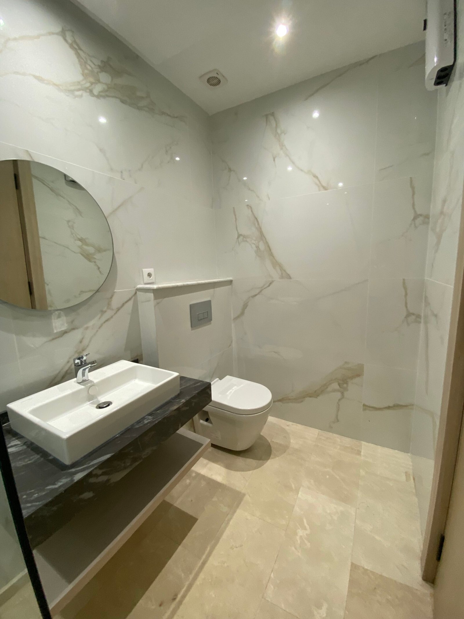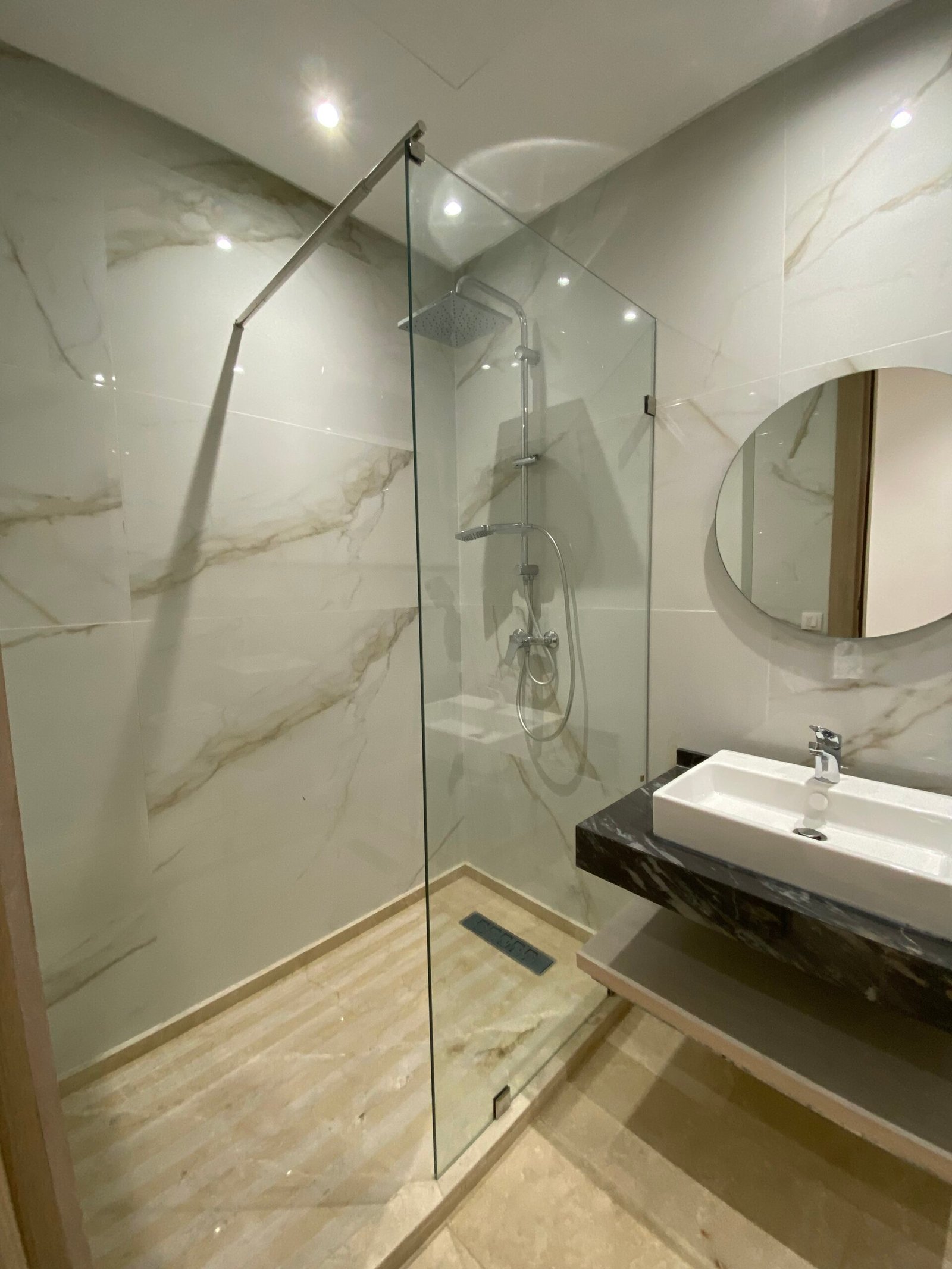 Badkamer met inloopdouche en marmerlook tegels