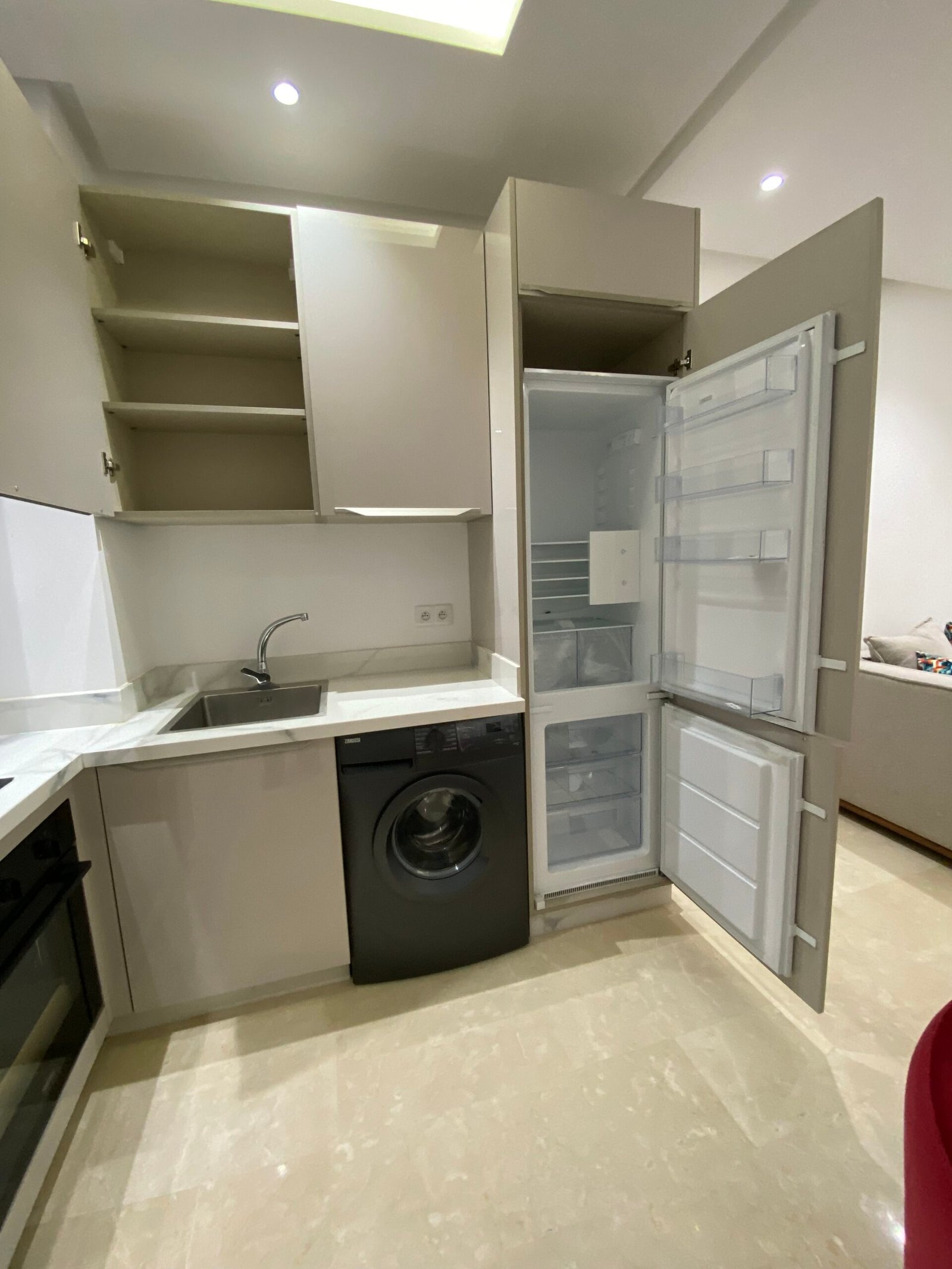 Ingerichte keuken met inductieplaat, oven, wasmachine, koelkast en afzuigkap